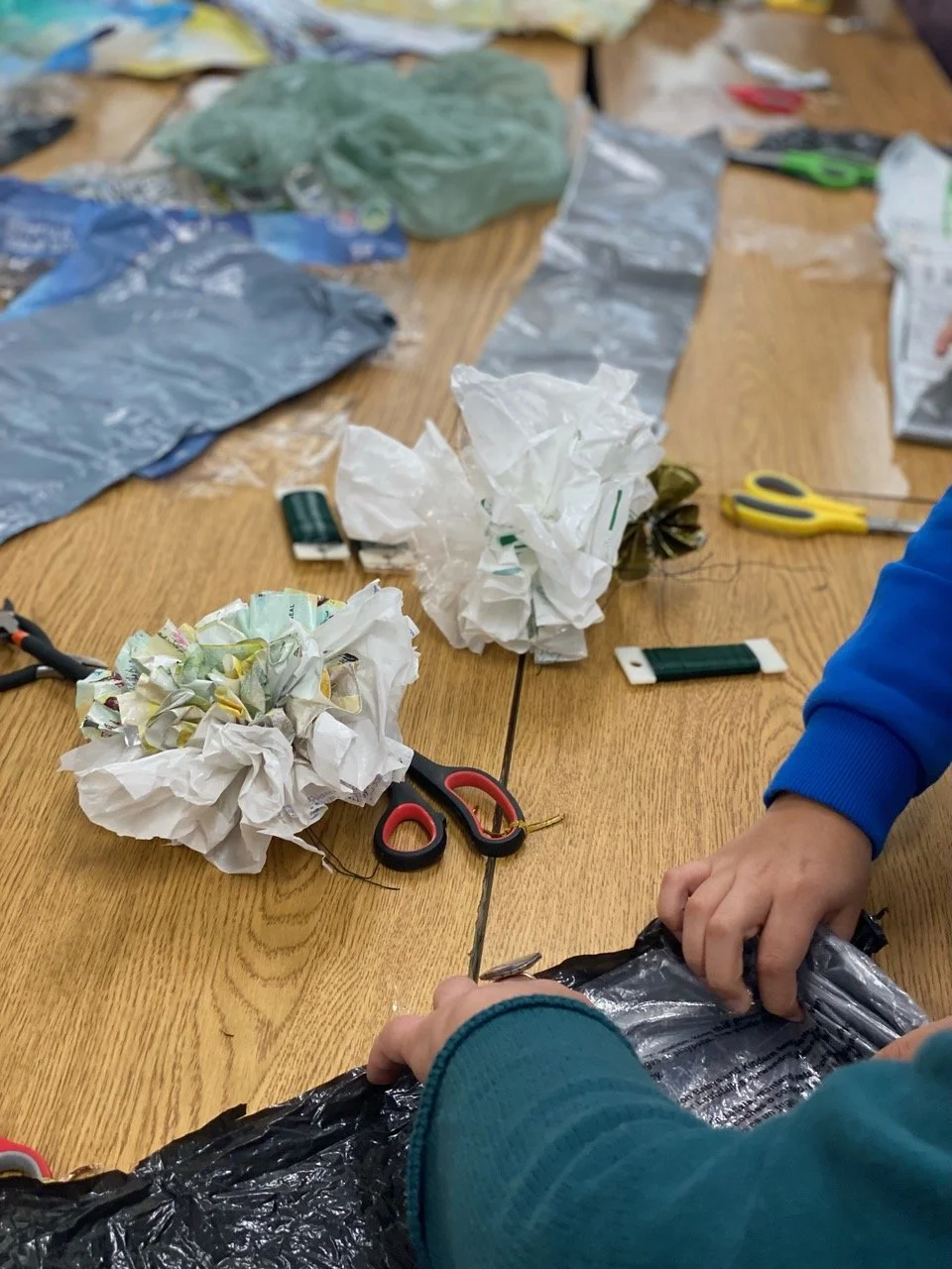 Learn to transform discarded packaging - like bread bags and produce wrappers - into sculptural blooms while reflecting on plastic pollution and the power of creative reuse.